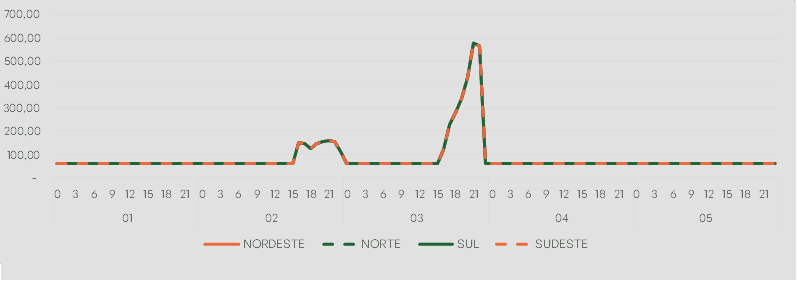 De acordo com a Função de Custo Futuro (FCF) divulgada pela CCEE no último dia 29, para a semana de 30/11 a 06/12, espera-se uma redução nos preços em todos os submercados, devido à melhoria nas previsões de precipitações para o mês de dezembro.