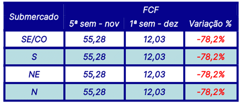 De acordo com a Função de Custo Futuro (FCF) divulgada pela CCEE no último dia 29, para a semana de 30/11 a 06/12, espera-se uma redução nos preços em todos os submercados, devido à melhoria nas previsões de precipitações para o mês de dezembro.