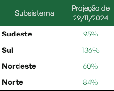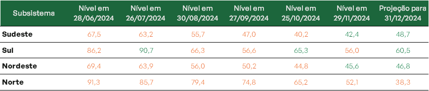 Os reservatórios dos subsistemas Sudeste e Nordeste se destacam, apresentando aumento nos seus níveis em comparação com o mês anterior. Espera-se ainda que, ao final de dezembro, as regiões Sul e Sudeste tenham os maiores níveis de armazenamento, com volumes superiores a 48%.