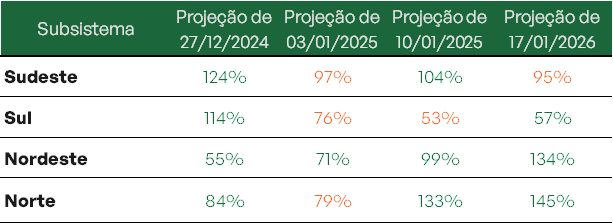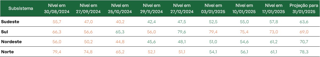 As chuvas registradas contribuíram para o aumento dos níveis dos reservatórios em quase todos os subsistemas, com exceção da região Sul, que mantém uma tendência de queda nas últimas semanas.