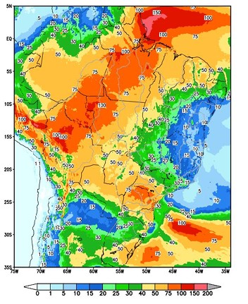 Uma nova frente fria deve trazer precipitações para a regiões Sul e instabilidades para as demais regiões. As maiores precipitações devem ocorrer nas bacias dos rios Paranapanema, Madeira e Tapajós.