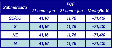 No dia 10 de janeiro, a Função de Custo Futuro – FCF, divulgada pela CCEE, apontou uma tendência de queda nos preços em todos os submercados durante o período de 11 a 17 de janeiro, com previsão de fechamento a R$/MWh 11,76.