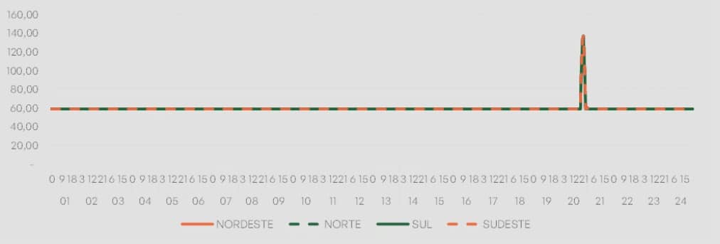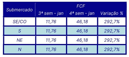 No dia 17 de janeiro, a Função de Custo Futuro – FCF, divulgada pela CCEE, apontou uma elevação nos preços em todos os submercados durante o período de 18 a 24 de janeiro, com previsão de fechamento a R$/MWh 46,18.