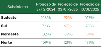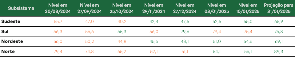As chuvas já registradas contribuíram para o aumento dos níveis dos reservatórios em quase todos os subsistemas, com exceção da região Sul, que apresentou uma leve queda, sem grande impacto.
