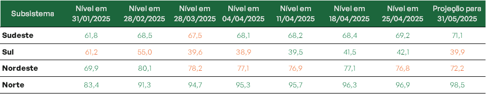 Os maiores volumes de armazenamento foram registrados nos subsistemas Norte e Sudeste, que alcançaram cerca de 97% e 69% de sua capacidade, respectivamente. Os demais subsistemas variam entre 42% e 76%.