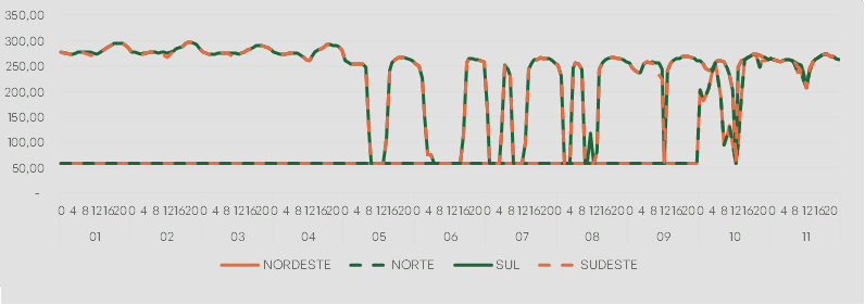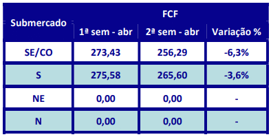 A Função de Custo Futuro (FCF), divulgada pela CCEE para a semana em curso, aponta queda nos preços esperados para o Sul e Sudeste, com uma variação de aproximadamente 4% e 6% em relação à semana anterior, respectivamente. Por sua vez, os demais submercados não apresentam alterações.