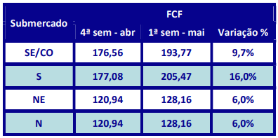A Função de Custo Futuro – FCF divulgada pela CCEE no último dia 25, aponta aumento nos preços médios desta semana em todos os submercados: 6% no Norte e Nordeste, 16% no Sul e cerca de 10% no Sudeste.