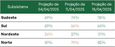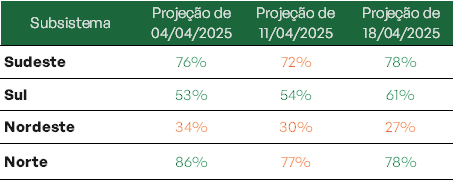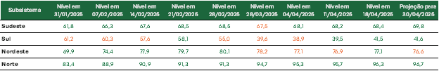 Os subsistemas Norte e Nordeste se destacam por atingirem níveis superiores a 77% de sua capacidade de armazenamento. Os demais subsistemas, Sul e Sudeste, também registraram aumento em seus volumes se comparado à semana anterior, alcançando cerca de 42% e 68%, respectivamente.
