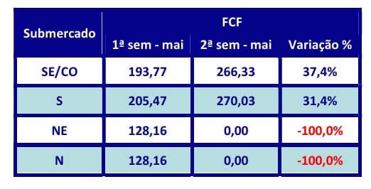 A Função de Custo Futuro – FCF divulgada pela CCEE no último dia 30/04, aponta redução nos preços médios desta semana nos submercados Norte e Nordeste e subida no Sul e Sudeste: