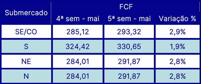 Comparando com a Função de Custo Futuro (FCF) da semana anterior (4ª semana), houve um aumento nos valores projetados para todos os submercados. O SE/CO variou +2,9%, o Sul +1,9%, e Nordeste e Norte +2,8%. Essa variação é influenciada, entre outros fatores, pela expectativa de geração das Usinas Não Simuladas Individualmente (UNSI).
