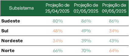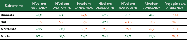Previsão de níveis de armazenamento para final de maio/2025 (%)