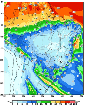 Nesta semana, a passagem de uma frente fria pela região Sul e pelo litoral do Sudeste deve provocar precipitação nas bacias dos rios Jacuí, Iguaçu, Uruguai, Paranapanema e na incremental à UHE Itaipu, com volumes variando entre a média e abaixo da média. Nas demais bacias hidrográficas do SIN, não há previsão de precipitações significativas.