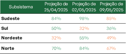 Os maiores níveis de armazenamento foram registrados nos subsistemas Norte e Nordeste, que atingiram aproximadamente 98% e 76% de sua capacidade, respectivamente. O Sudeste também apresenta situação favorável, com reservatórios operando em torno de 70% da capacidade.