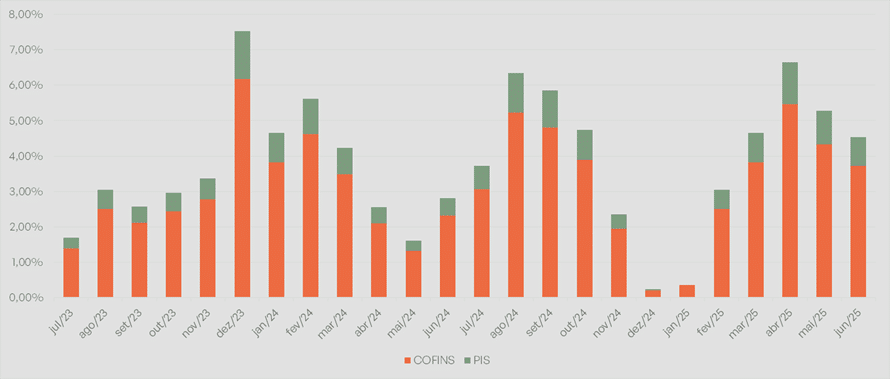 O gráfico das alíquotas de PIS/COFINS é um bom exemplo de como, mesmo com a energia previsível, o custo total da conta pode oscilar significativamente.