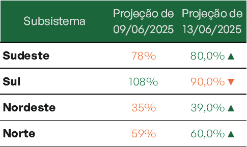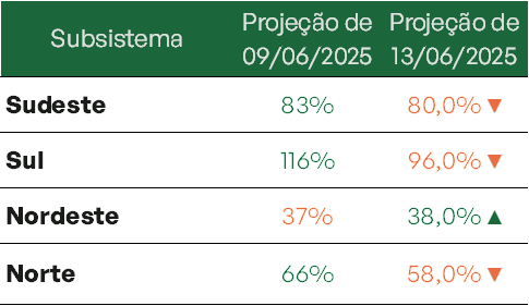 A melhora no Sul se dá após semana de afluências acima da média, enquanto Sudeste e Nordeste iniciam um comportamento típico do período seco, com leve queda nos níveis de armazenamento. As previsões indicam que o Sudeste deve encerrar junho com 67,1% e o Nordeste com 69,3%. Essa dinâmica dos reservatórios reflete diretamente a distribuição das chuvas observadas e previstas nas bacias hidrográficas de interesse do Sistema Interligado Nacional – SIN.