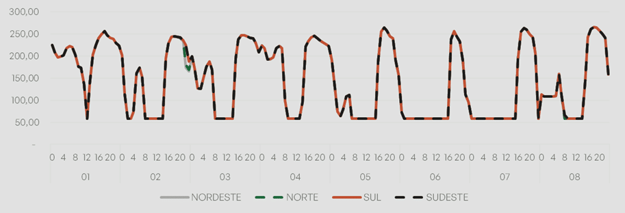 O Preço de Liquidação das Diferenças – PLD inicia a semana com os quatro submercados apresentando valor médio de R$/MWh 145,76, representando uma queda de 29% em relação à semana anterior e mantendo a trajetória de redução observada no mês.