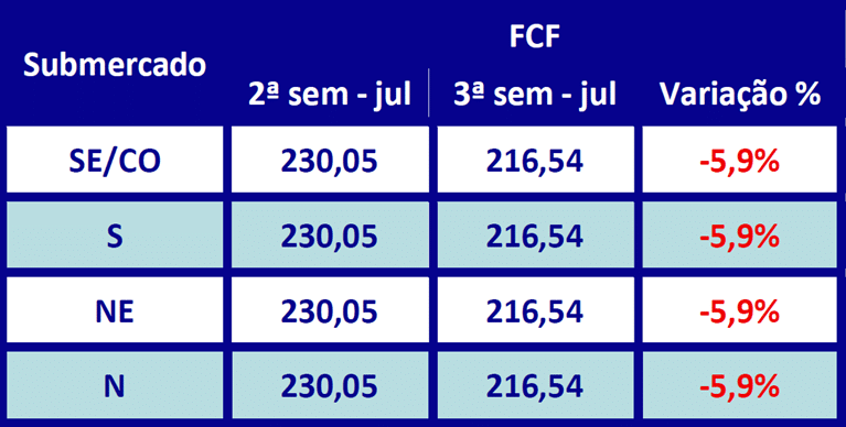 O relatório divulgado também pela Câmara de Comercialização de Energia Elétrica – CCEE, na última sexta (11/07), referente à terceira semana operativa de julho (período de 12 a 18/07), mostra que a Função de Custo Futuro – FCF deve recuar nesta semana.