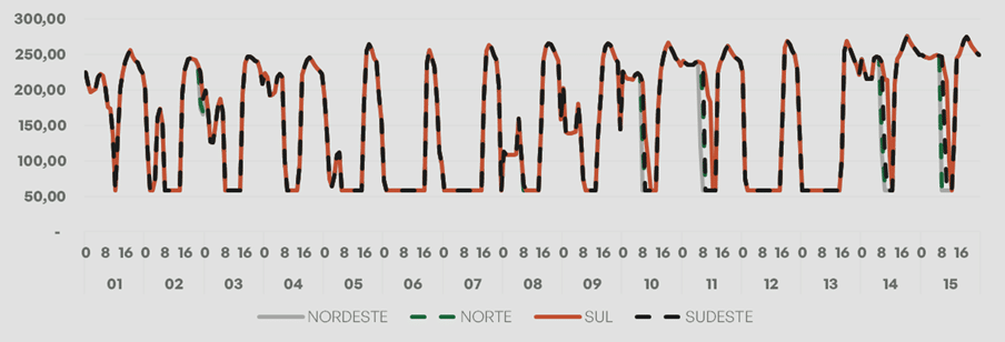 Hoje o Preço de Liquidação das Diferenças – PLD apresentou variação em todos os submercados, atingindo valores médios de R$/MWh 159,99 no Sudeste, R$/MWh 163,16 no Sul, R$/MWh 159,26 no Nordeste e R$/MWh 158,26 no Norte. Esse aumento em relação à semana anterior, rompendo a tendência de queda observada nas últimas semanas.