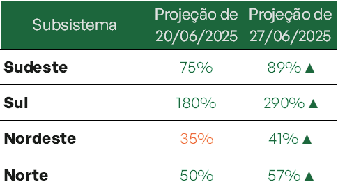 Na comparação com a semana anterior, todos os subsistemas apresentaram aumento na previsão de Energia Natural Afluente – ENA. O Sul lidera com folga, atingindo 290% da Média de Longo Termo – MLT. Sudeste/CO chega a 89%, Nordeste a 41% e Norte com 57%. Apesar dos avanços percentuais na previsão, esse aumento tem efeito prático limitado — servindo apenas para manutenção dos reservatórios.