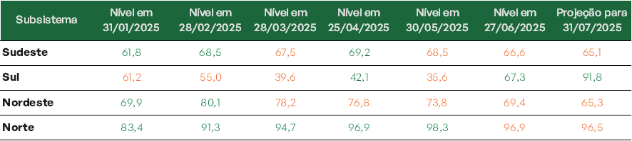 Previsão de níveis de armazenamento para jul/2025 (%)