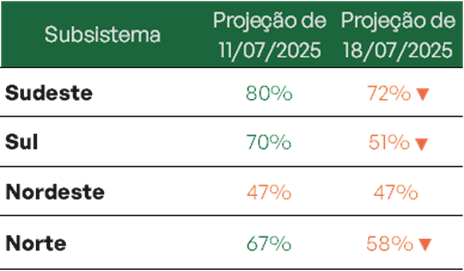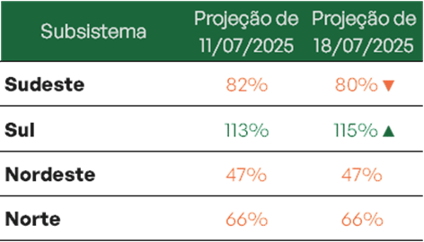 Embora o Sul tenha previsão de apenas 51% da MLT para esta semana, há sinais de que fechará julho acima da média, com um acumulado mensal de 115% da MLT, resultado das semanas anteriores que apresentaram afluências elevadas.