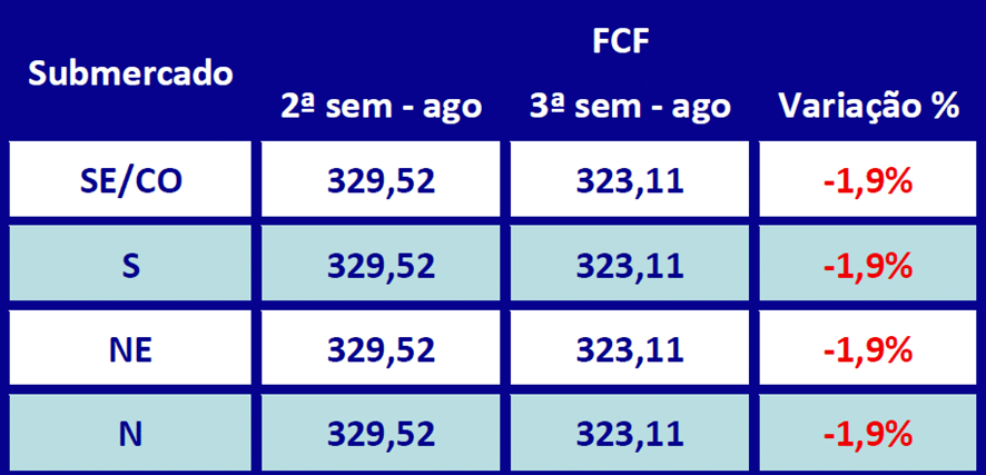 Quanto a Função de Custo Futuro – FCF, as previsões do modelo DECOMP apontam uma redução de 1,9% na terceira semana operativa de agosto em relação à semana anterior, com valores podendo chegar a R$/MWh 323,11 em todos os submercados.
