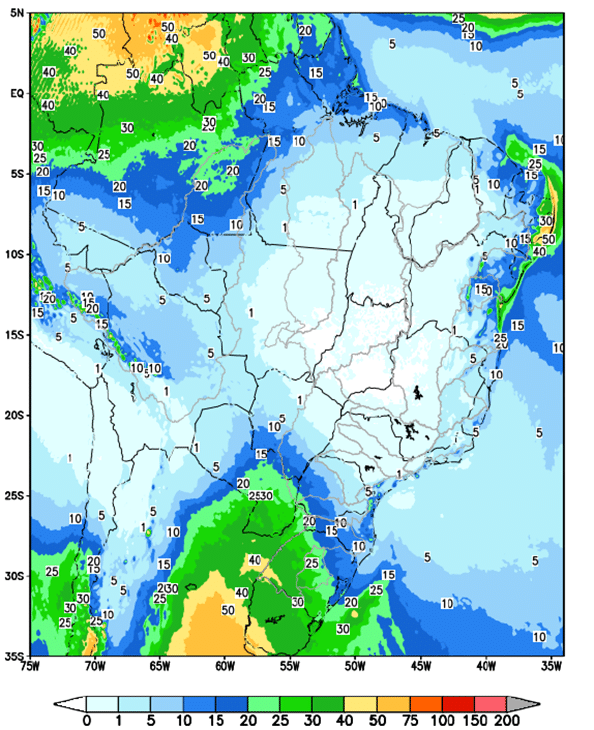 Durante a semana, o predomínio deve ser de céu claro nas principais bacias do SIN. Apenas no final do período há possibilidade de chuvas fracas nas bacias dos rios Jacuí, Uruguai e Iguaçu, mas com volumes abaixo da média. Nas demais regiões, não há expectativa de precipitações significativas.