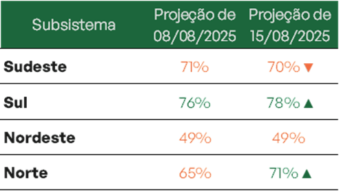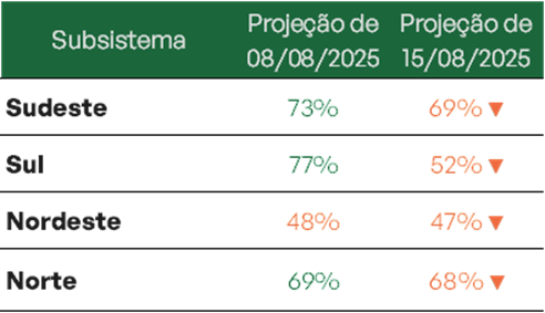 Por sua vez, as projeções de Energia Natural Afluente – ENA para esta semana apontam uma queda nas afluências em todos os subsistemas. Espera-se 69% da Média de Longo Prazo – MLT no Sudeste/Centro-Oeste, 52% no Sul, 47% no Nordeste e 68% no Norte. De forma geral, para o mês de agosto, as afluências devem permanecer abaixo da média histórica em todas as regiões.