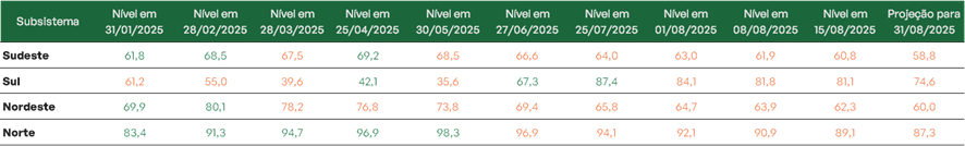 Previsão de níveis de armazenamento para ago/2025 (%)