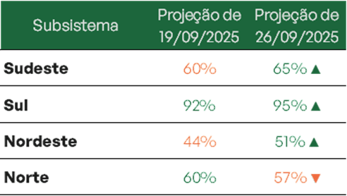 As Energias Naturais Afluentes – ENAs também apresentam comportamento heterogêneo. Para a semana atual, o Sudeste/Centro-Oeste tem previsão de 59% da Média de Longo Termo – MLT, o Sul de 91%, o Nordeste de 47% e o Norte de 52%. Para o fechamento de outubro, o ONS projeta elevação apenas no Sudeste e no Nordeste, chegando a 65% e 51% da MLT, respectivamente. O Sul deve permanecer próximo à média histórica, com 95% da MLT, enquanto o Norte tende a recuar para 57%.