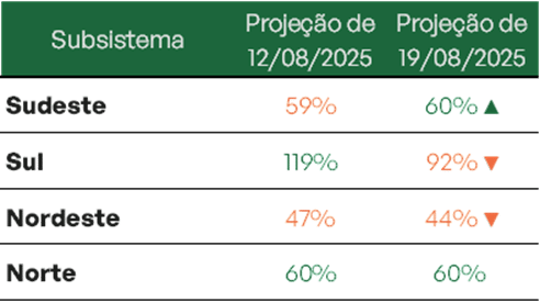 No Sudeste/Centro-Oeste, o nível dos reservatórios reduziu para 52,7%, o Nordeste para 56,2%. Por sua vez, o Sul, apesar da diminuição frente aos 90,1% registrados na última semana, permanece com 89,0% e o Norte de 84,6% para 83,6%, cenário ainda bastante favorável.