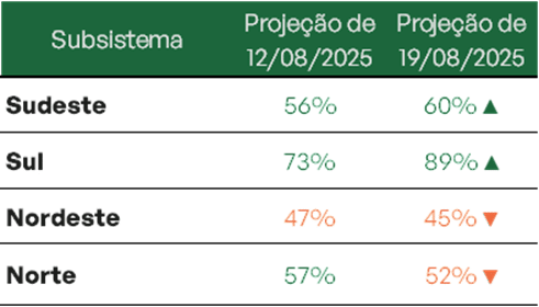 As Energias Naturais Afluentes – ENAs apresentam variações importantes nesta semana. O Sudeste/Centro-Oeste registra leve alta na previsão, com 60% da Média de Longo Termo – MLT, enquanto o Sul indica 89% da MLT. Por outro lado, o Nordeste e o Norte continuam com previsões próximas da metade da MLT, com 45% e 52%, respectivamente. Para o fechamento de setembro, o ONS projeta 60% no Sudeste/Centro-Oeste, 92% no Sul, 44% no Nordeste e 60% no Norte.