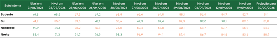 Todos os submercados registram recuo gradativo dos níveis, com previsões indicando continuidade dessa tendência.