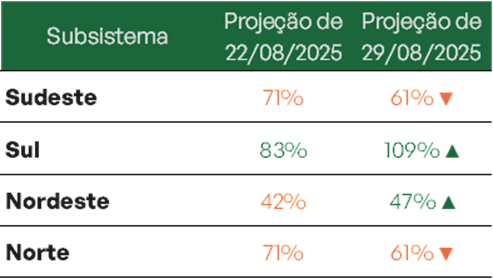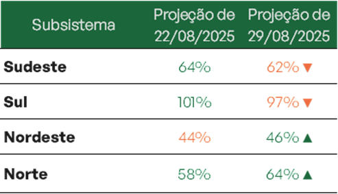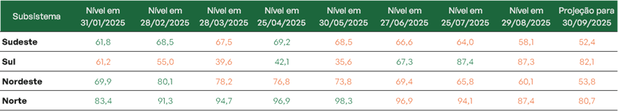 No Sudeste/Centro-Oeste, o armazenamento encerrou o mês com 58,1% em 29 de agosto, com projeção de encerrar setembro em 52,4%. O Sul, após alcançar 87,3%, tende a reduzir para 82,1%. Já o Nordeste mantém trajetória de esvaziamento gradual, passando de 60,1% para 53,8% ao fim do mês. O Norte, mesmo em patamar elevado, caiu de 87,4% e deve chegar a 80,7%.