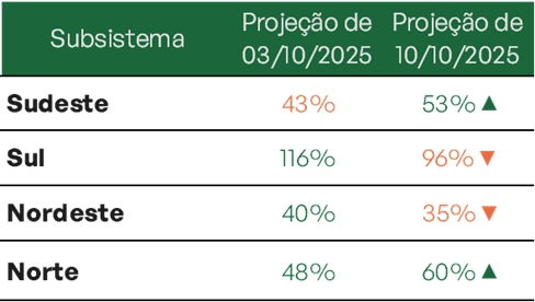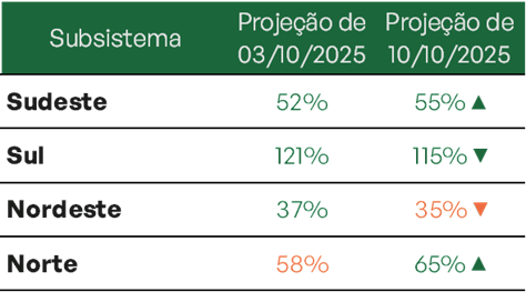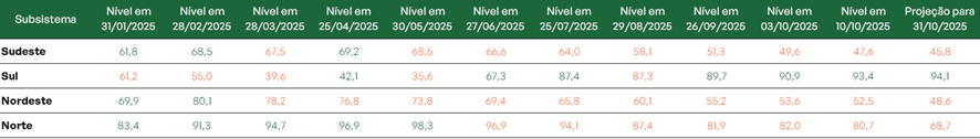 No Sudeste/Centro-Oeste, principal subsistema do país, o armazenamento recuou para 47,6% de sua capacidade, com projeção de encerrar outubro em 45,8%. No Nordeste, os reservatórios caíram para 52,5%, com estimativa de fechamento do mês em 48,6%. O Norte registra 80,7%, com previsão de 68,7% até o final de outubro. O Sul, por sua vez, apresenta 93,4% e tendência de leve alta, podendo chegar a 94,1%.