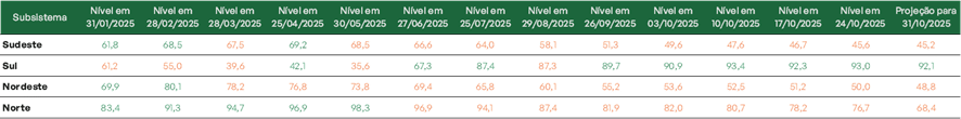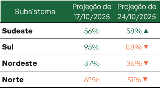 As Energias Naturais Afluentes – ENAs apresentam comportamento abaixo da Média de Longo Termo – MLT em todas as regiões, reforçando a tendência hidrológica desfavorável que marcou outubro. Para a semana de 25 a 31 de outubro, o Sudeste/Centro-Oeste deve registrar 61% da MLT, o Sul 71%, o Nordeste 31% e o Norte 50%. Para o fechamento do mês, a previsão do ONS aponta 58% da MLT no Sudeste, 88% no Sul, 36% no Nordeste e 51% no Norte, confirmando afluências inferiores ao comportamento histórico em praticamente todo país.