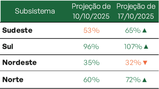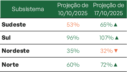 As Energias Naturais Afluentes – ENAs apresentaram melhora em relação à semana anterior. Para o período, o ONS prevê 65% da Média de Longo Termo – MLT no Sudeste/Centro-Oeste, 107% no Sul, 32% no Nordeste e 72% no Norte. Já a previsão mensal para outubro indica 56% da MLT no Sudeste/Centro-Oeste, 95% no Sul, 37% no Nordeste e 62% no Norte. Mesmo com a elevação pontual das afluências, o ONS reforça que todas as regiões, com exceção do Sul, devem permanecer abaixo da média histórica ao longo do mês.