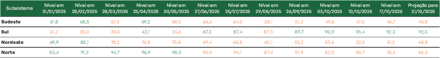 De acordo com o relatório, os reservatórios do Sudeste/Centro-Oeste iniciaram a semana com 46,7% da capacidade, praticamente estáveis em relação à semana anterior, quando estavam em 47,6%. A previsão indica que o subsistema deve encerrar outubro com 45,8%. No Nordeste, os volumes seguem reduzindo gradualmente, partindo de 51,2% para 48,8% até o final do mês. Já o Sul mantém situação confortável, com armazenamento acima de 92%, e o Norte, apesar de ainda apresentar níveis satisfatórios (78,2%), deve encerrar outubro com 68,3%, acompanhando o comportamento sazonal de redução.