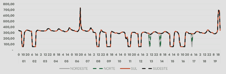 O Preço de Liquidação das Diferenças – PLD apresentou alta nesta quarta-feira (19/11), registrando valores médios próximos de R$/MWh 283,00 nos submercados. De acordo com dados atualizados da CCEE, os valores médios do dia foram de R$/MWh 284,82 no Sudeste/Centro-Oeste, R$/MWh 284,78 no Sul, R$/MWh 280,08 no Nordeste e R$/MWh 282,36 no Norte.
