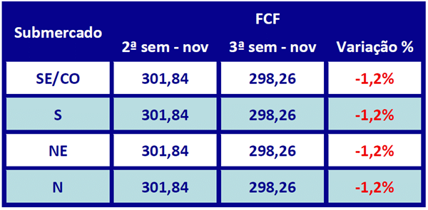 Segundo o relatório, a Função de Custo Futuro – FCF, que indica a tendência dos custos marginais de operação, indica queda de 1,2% na comparação com a semana anterior, passando de R$/MWh 301,84 para R$/MWh 298,26 em todos os submercados.