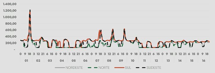 O movimento reflete um cenário de desacoplamento entre os submercados, observado ao longo do dia, com o Sul operando em patamar superior devido a condições hidrológicas mais restritivas, enquanto as demais regiões se beneficiaram de maior disponibilidade de geração renovável.
