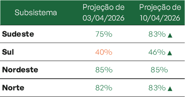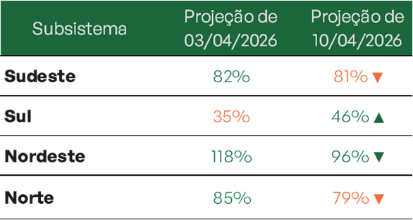 As Energias Naturais Afluentes – ENAs reforçam a mudança no regime hidrológico. Para esta semana de 11 a 17 de abril, o Sudeste/Centro-Oeste deve registrar 81% da Média de Longo Termo – MLT, enquanto o Norte apresenta 79% e o Nordeste 96%, próximo da média histórica. Já o Sul segue com desempenho inferior, com apenas 46% da MLT.