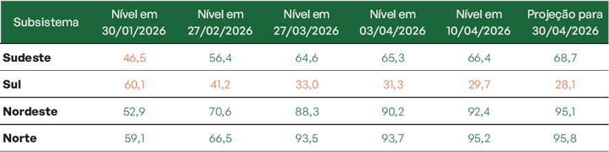 Em contrapartida, o Sul segue como principal ponto de atenção do sistema, com apenas 29,7%, e previsão de queda para 28,1%, refletindo a continuidade das condições hidrológicas desfavoráveis na região.